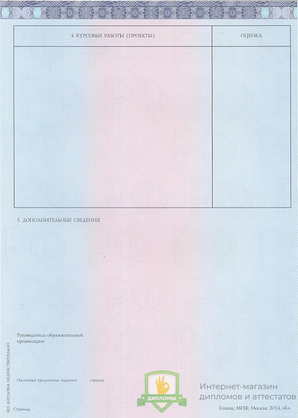 Изготовленный документ в компании «ОК-Дипломы» оформлен согласно действующим в Российской Федерации законам, соответствует нормам и особенностями, присущим тому или иному учебному заведению, имеет все элементы защиты.